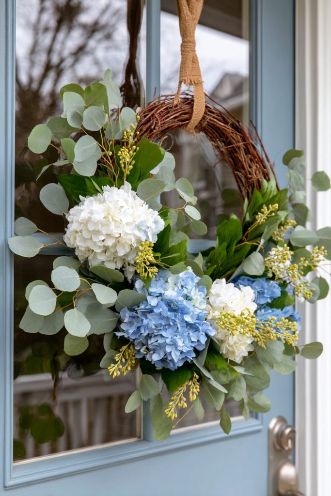You can add charm to your door with a hydrangea and eucalyptus winter wreath. The soft colors of hydrangeas mix well with the green eucalyptus leaves.