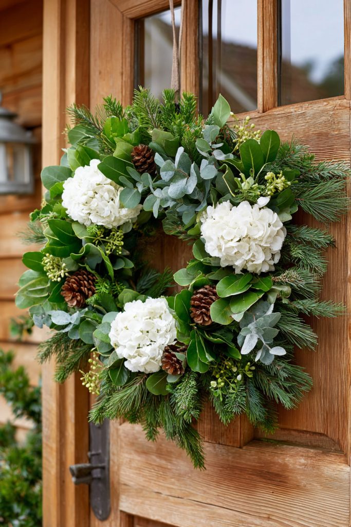 You’ll enjoy the natural look of this wreath made with hydrangea flowers and pine elements. It adds a soft and cozy touch to your front door in winter.