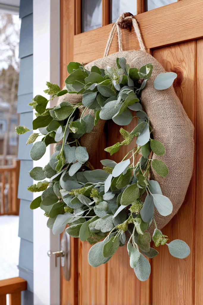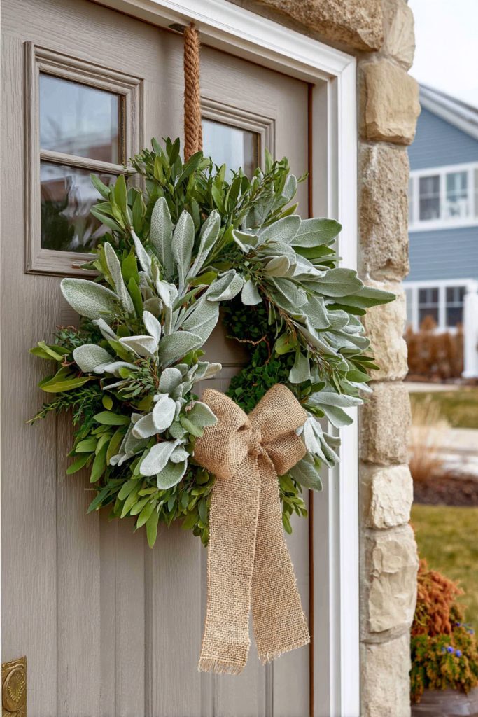 You can add a warm, cozy feel to your front door with a rustic burlap and lamb’s ear wreath. The soft green lamb’s ear leaves give a natural touch.