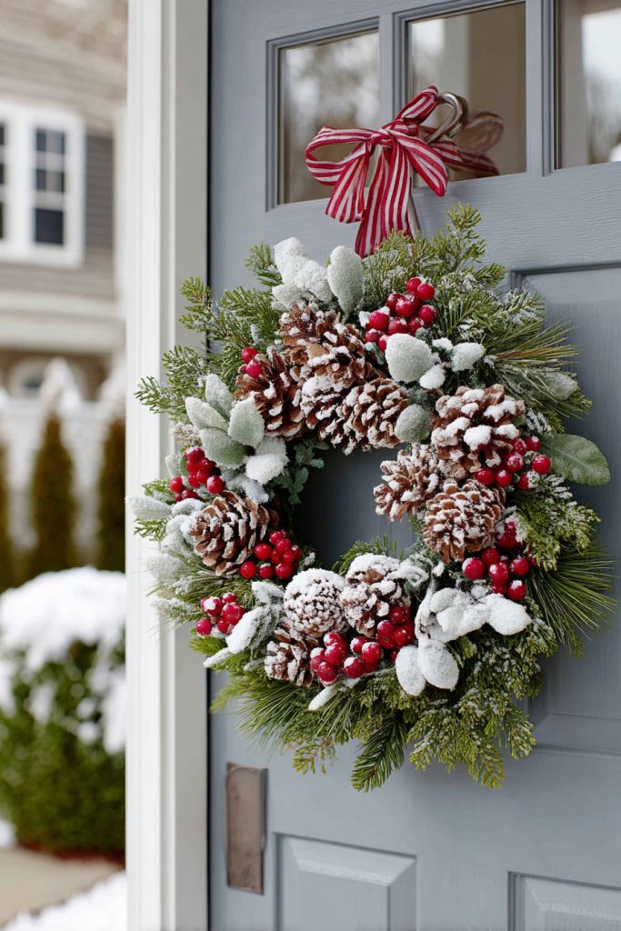 You can add a bright and festive touch to your front door with a sparkling winter berries wreath. It often includes white and light blue berries mixed with pinecones and faux greenery.