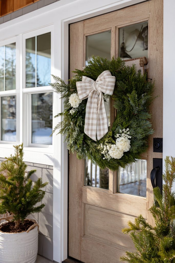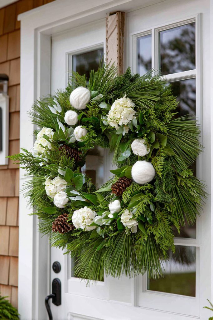 It feels cozy without being too bold. The snowballs give a gentle contrast against the green pine needles, making your doorway inviting all season long.