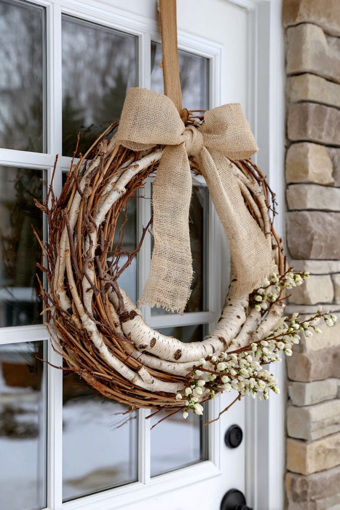You can add a simple, natural look to your front door with a minimal rustic twig wreath. Its design focuses on bare twigs, sometimes mixed with a few eucalyptus leaves for texture.