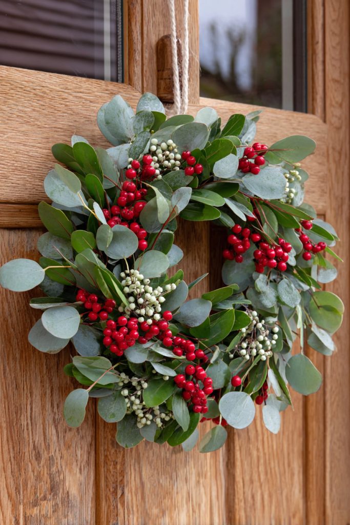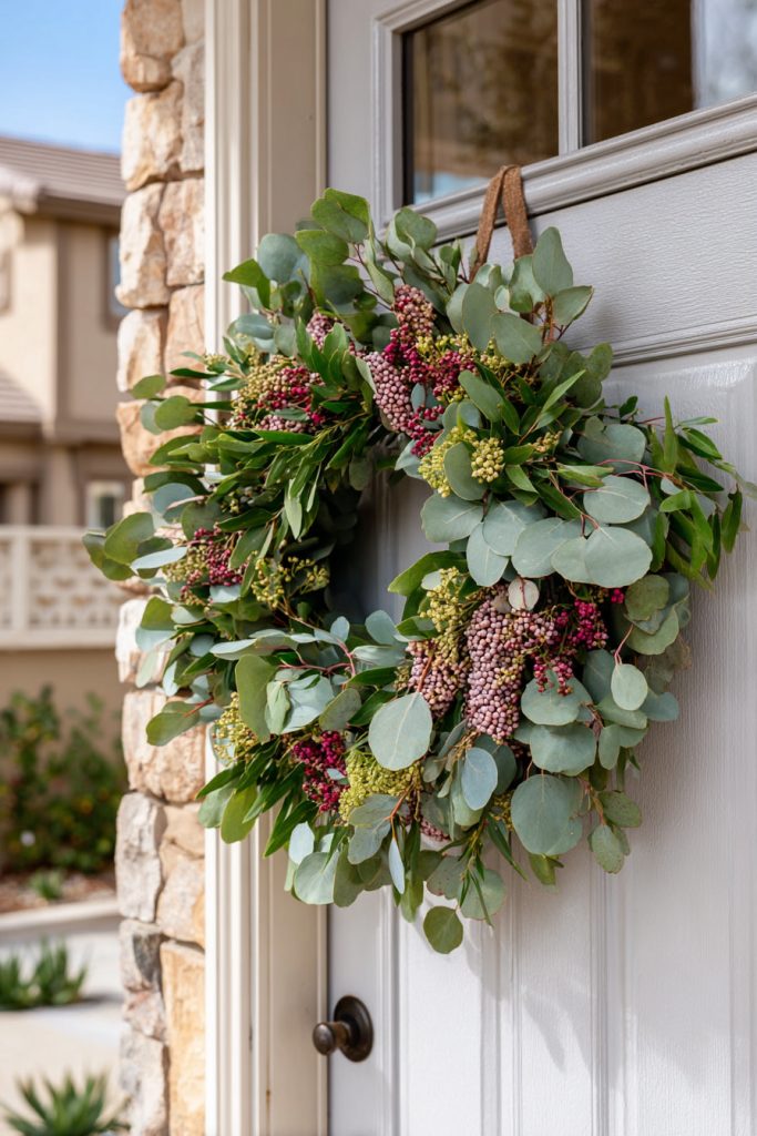 You can bring a fresh and natural look to your front door with a berry and eucalyptus artificial wreath. These wreaths mix green eucalyptus leaves with colorful berries for a simple, pretty design.