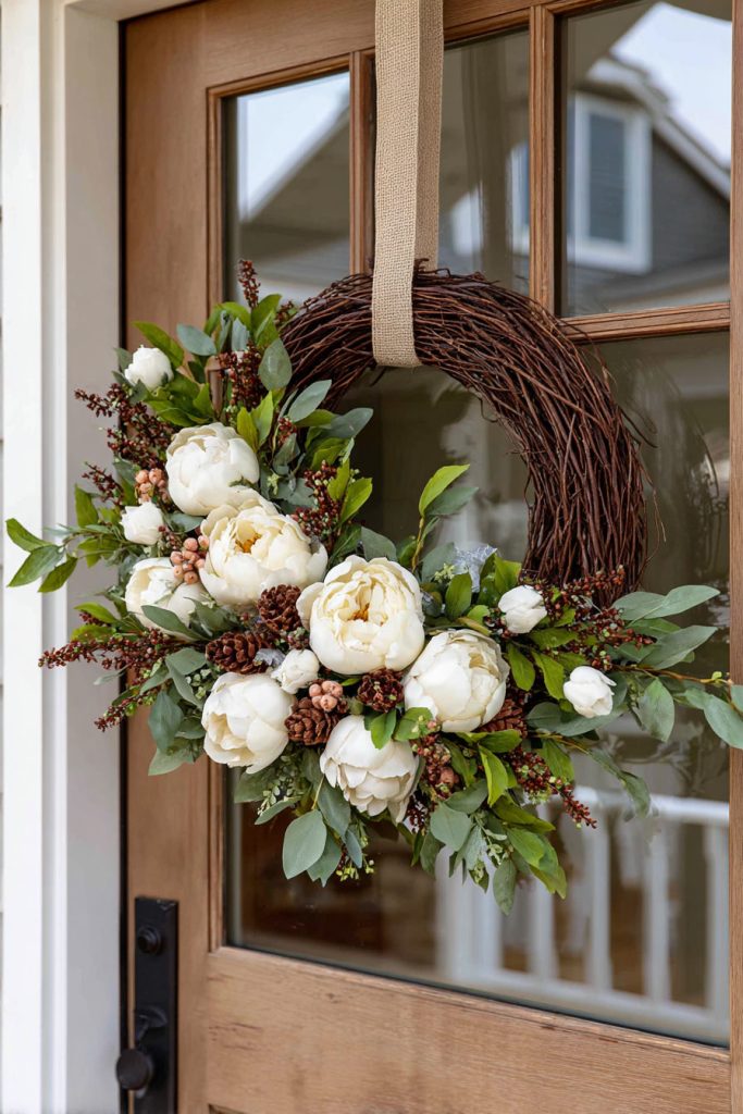 You can add a soft, elegant look to your front door with a faux cream peony half wreath. It blends cream-colored flowers with greenery for a simple, stylish design.