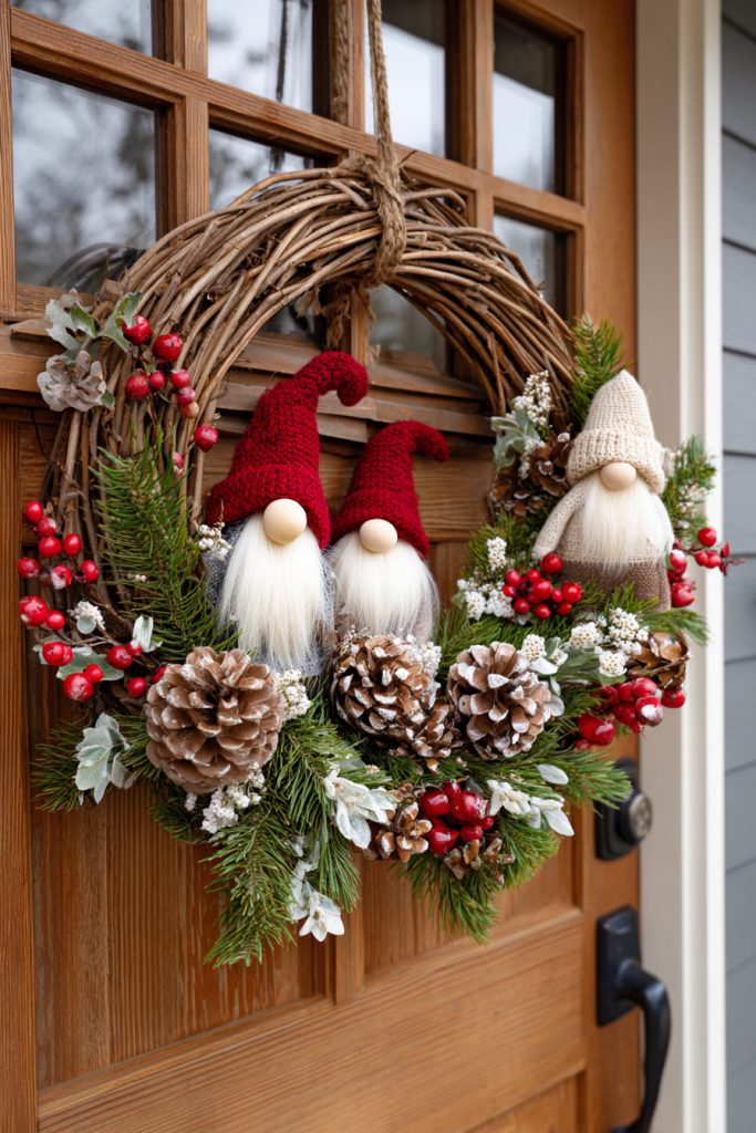 You can add a fun touch to your front door with a gnome themed wreath. These wreaths often feature cute gnomes, pine branches, and holiday decorations.