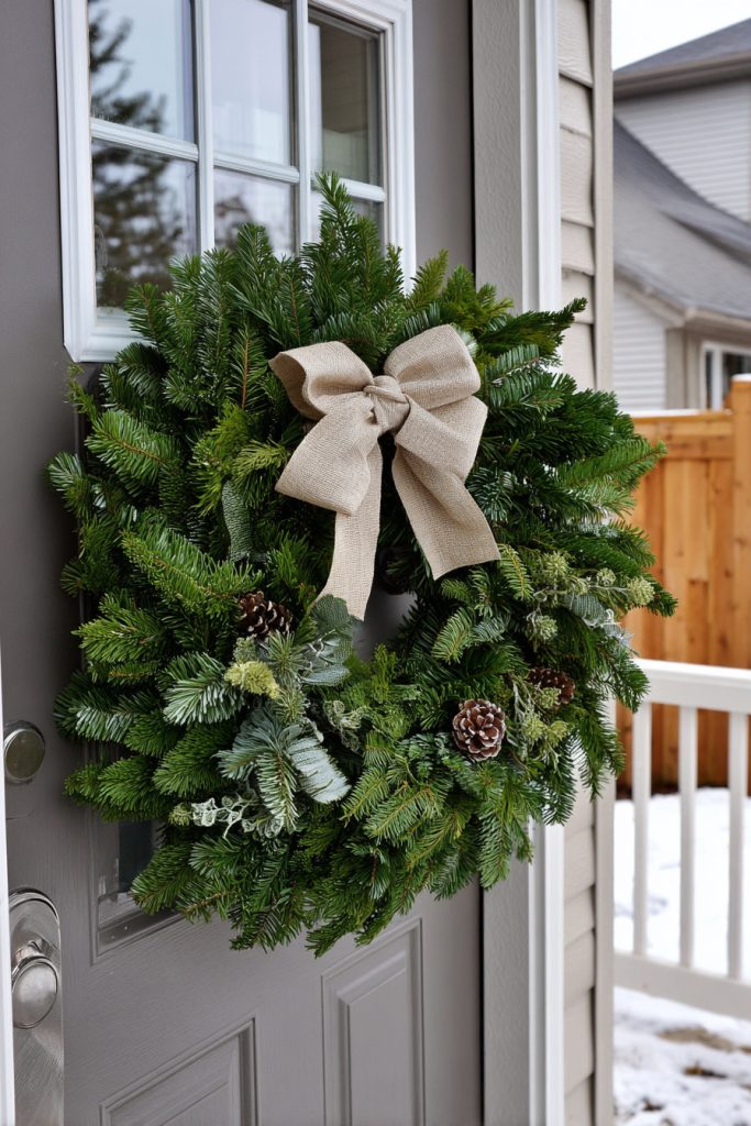 You can add a fresh evergreen wreath to your front door for a timeless look. These wreaths use real pine and cedar, giving your home a natural feel.