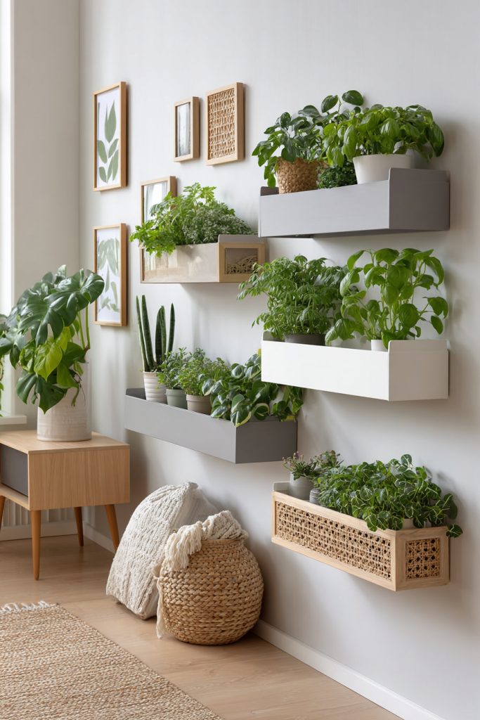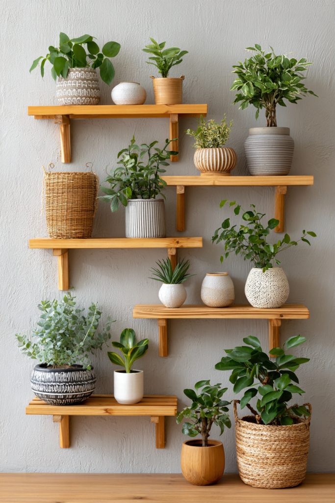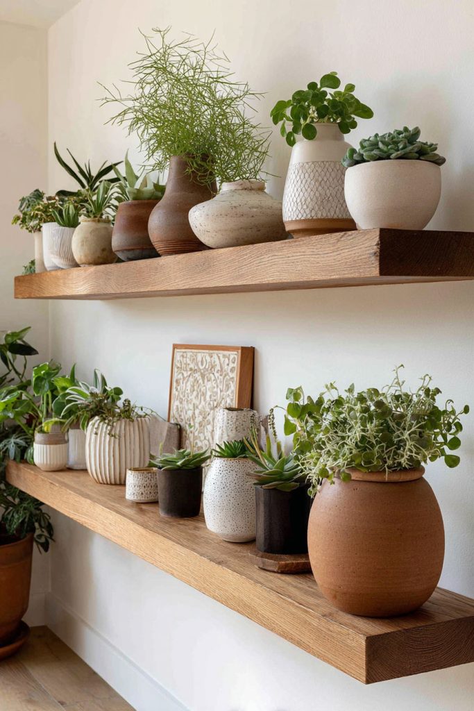 You can add warmth to your space with floating wooden shelves. They look great on neutral walls and help your plants stand out.