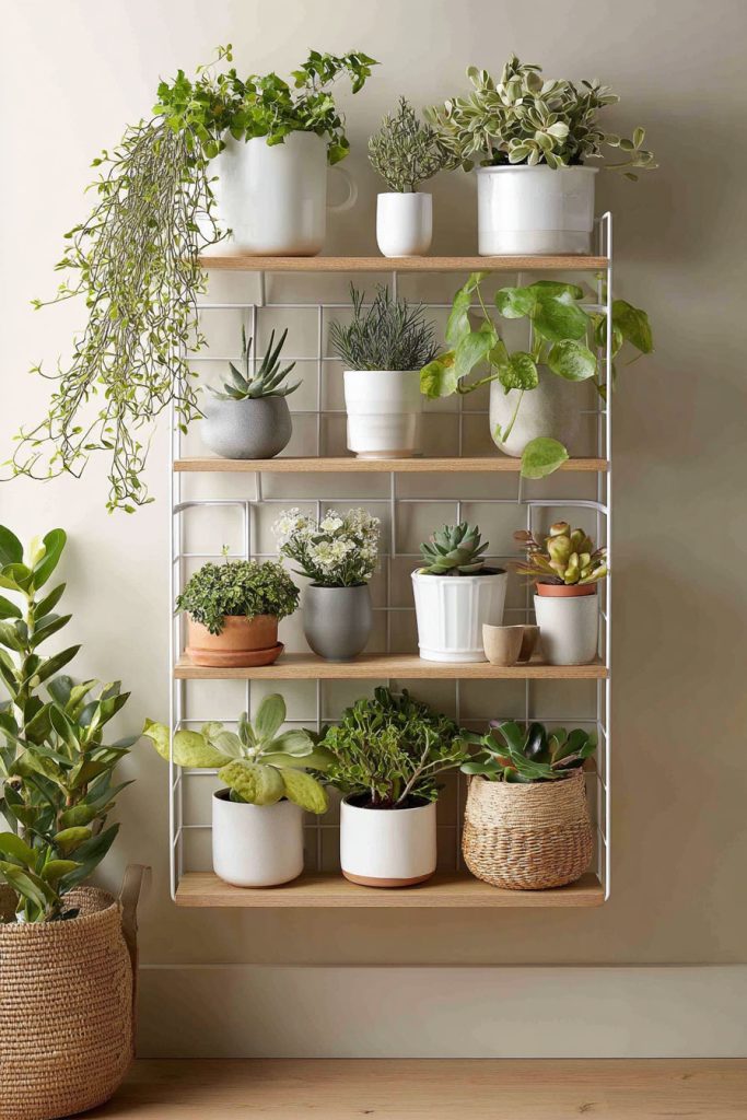 Trailing plants can hang down the sides, while bushy ones sit on the shelves for a nice balance. This setup adds life and texture to your space without crowding it.