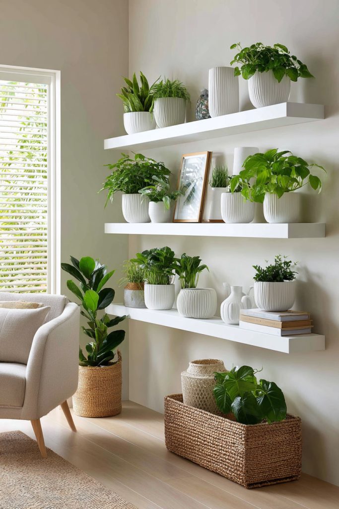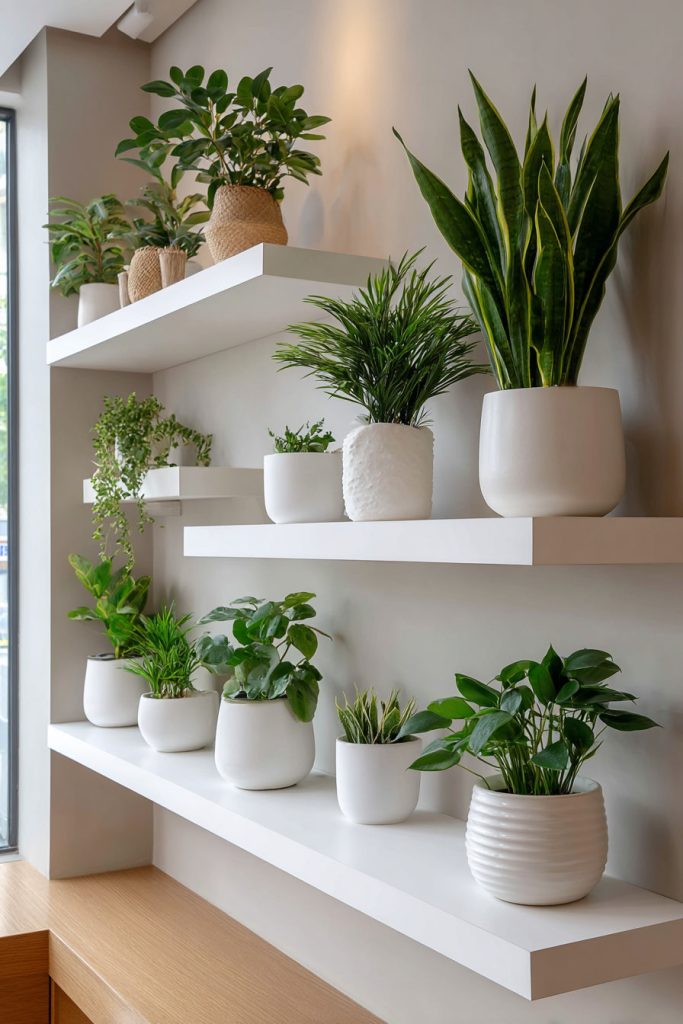 You can create a fresh look by using white floating shelves paired with both tall and short plants. Place the taller plants toward the back and shorter ones in front to add depth and interest.