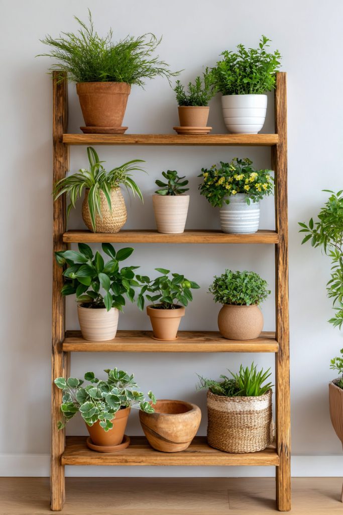 Trailing plants like ivy or pothos work well on ladder shelves, adding a nice touch of texture.