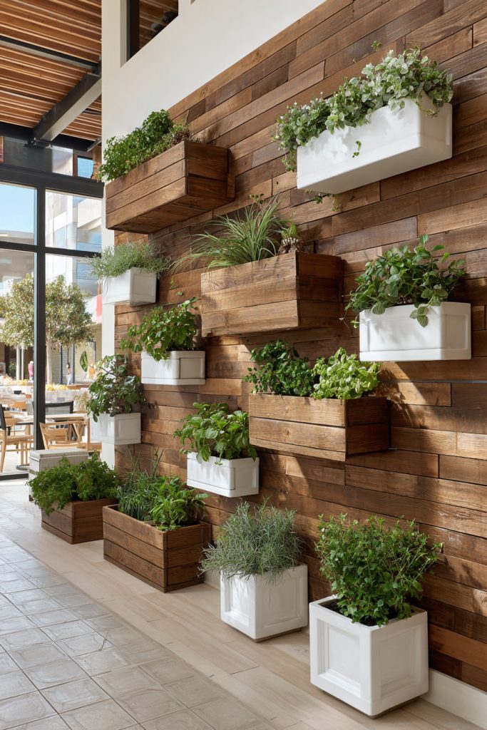 You can create a stylish look by mounting planters on open wooden slats. The slats add a natural, warm feel while keeping the space airy.