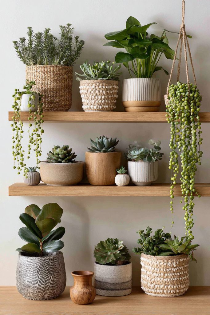 Try mixing terracotta pots with white ceramic ones. This blend gives your shelves a fresh and balanced look. The natural wood pairs well with both styles, creating a simple, cozy display for your plants.