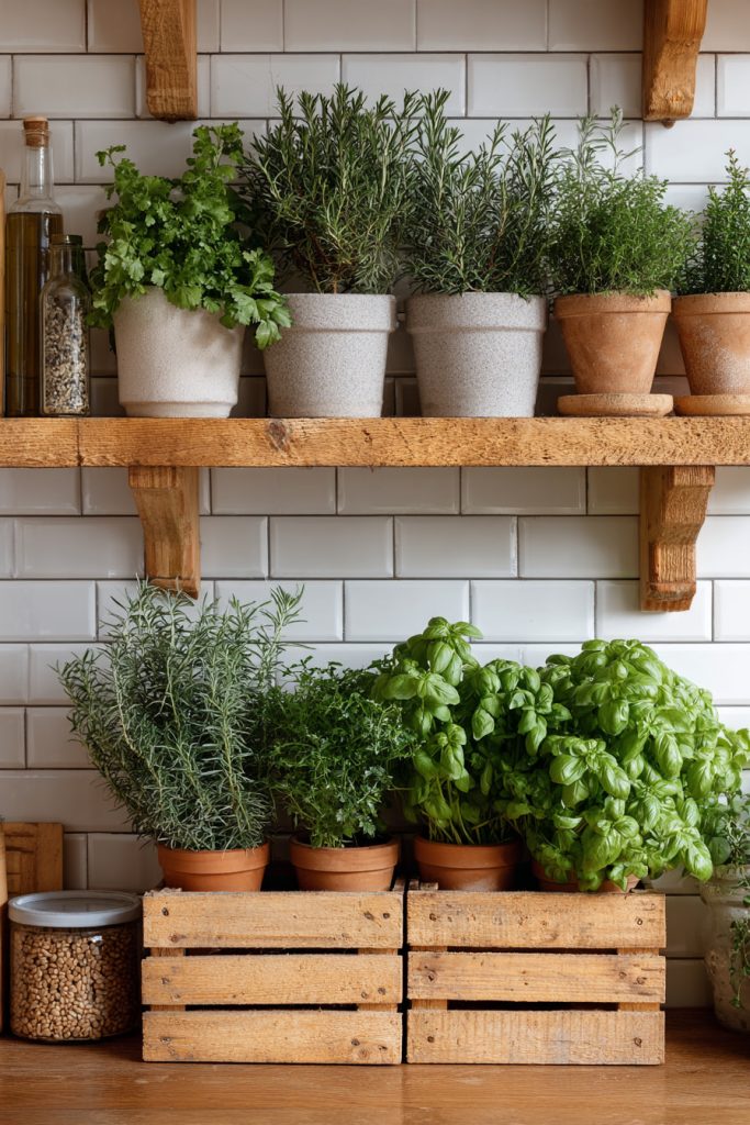 The natural look of pallet wood adds a warm, rustic touch. Plus, having fresh herbs within reach helps with cooking.