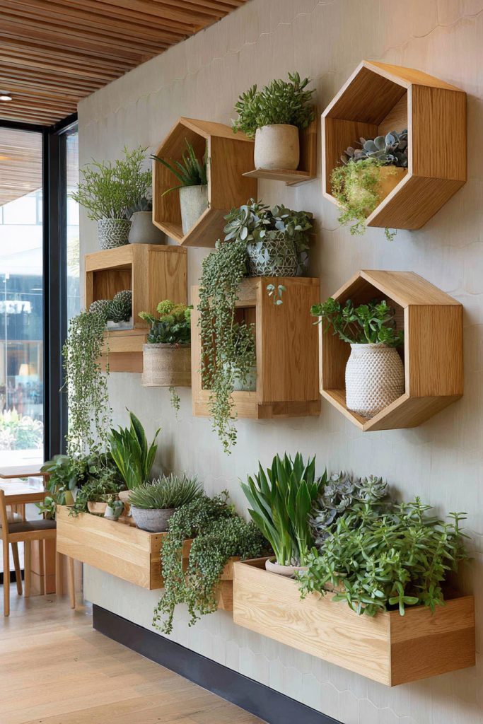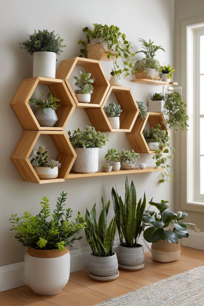 You can use hexagonal shelves to create fun, eye-catching plant displays. These shelves fit together like a puzzle, giving you the freedom to change your arrangement whenever you want.