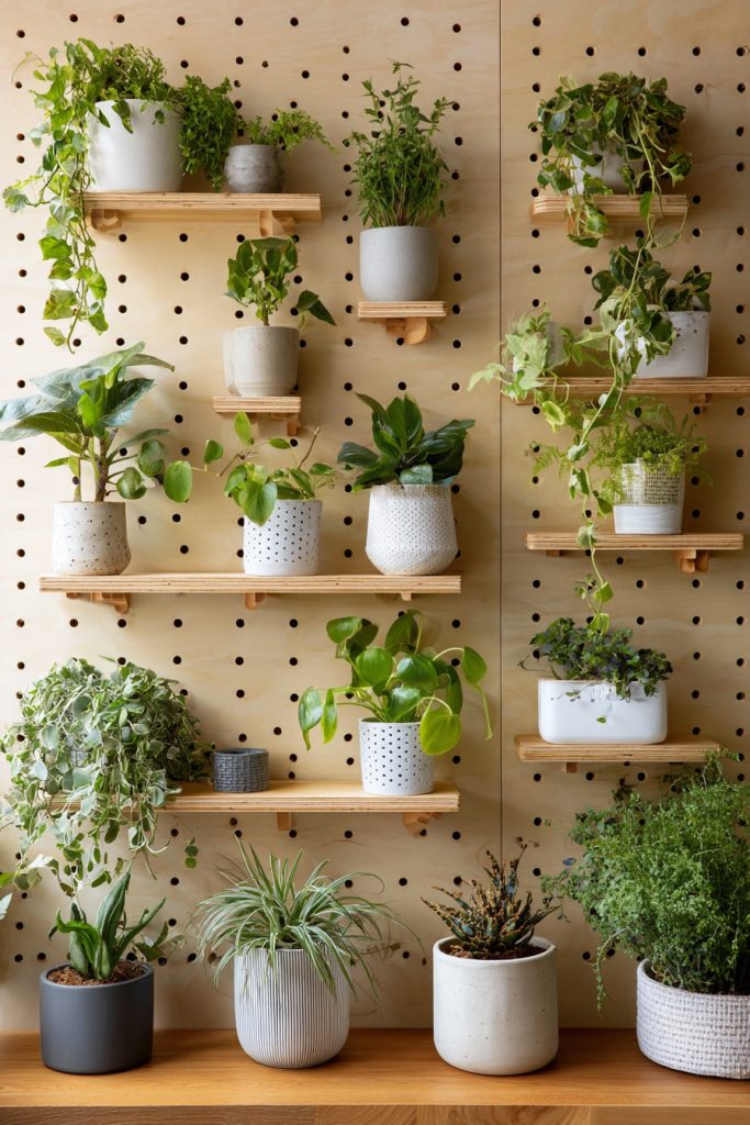 You can create a simple plant wall using a pegboard and some hooks. Just attach the pegboard to your wall and add small shelves or hooks to hold your pots.