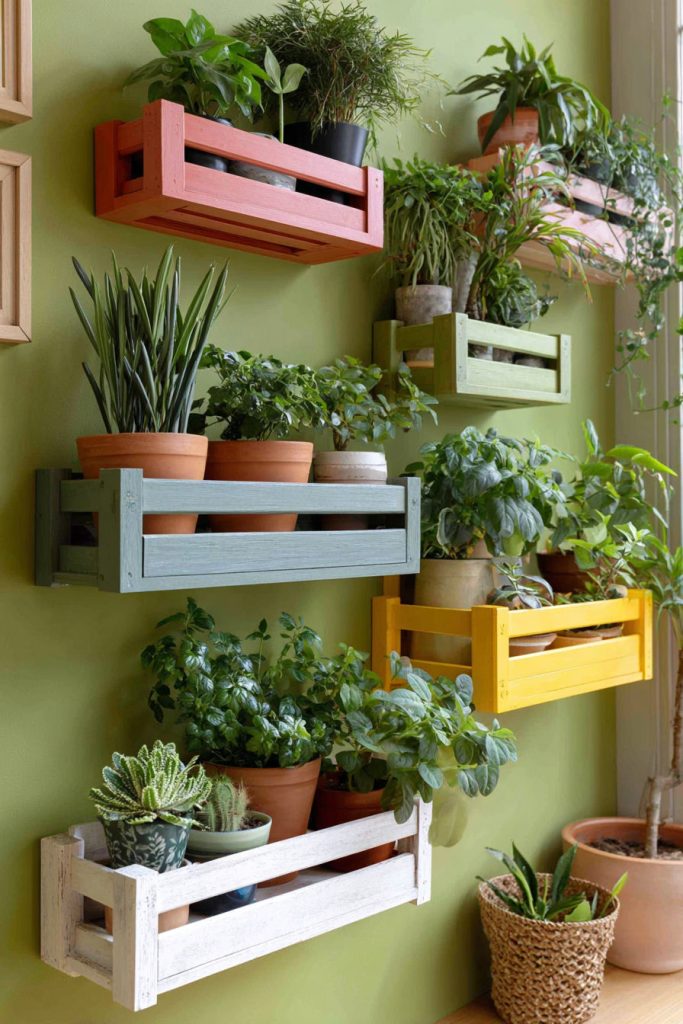 You can use colorful painted wood shelves to add a fun touch to your plant display. Bright colors make your plants stand out and make the space feel lively.