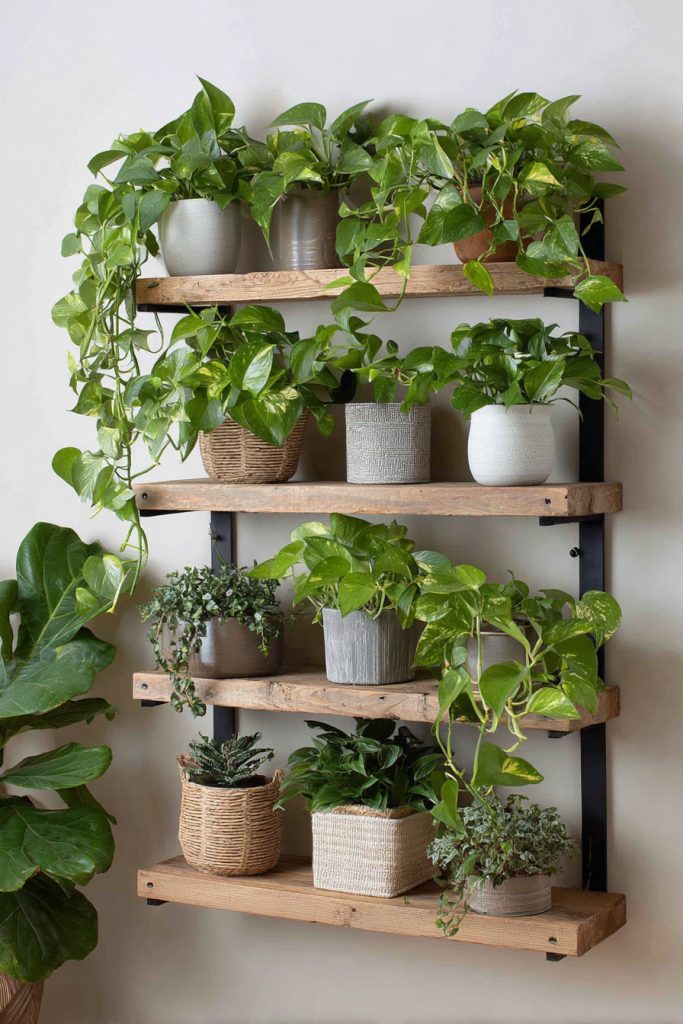 - 3. Multi-tiered wall shelves with trailing pothos plants