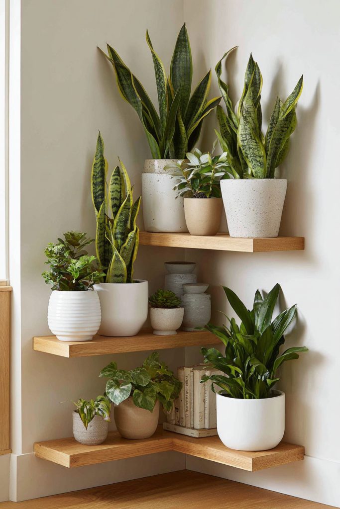 - 4. Corner-mounted shelves with snake plants for tight spaces
