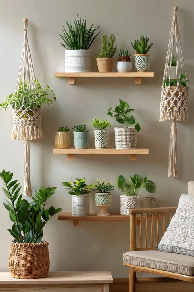 You can make a unique plant display by combining macrame hangers with small wall shelves. These hangers add a cozy, handmade touch to your space.