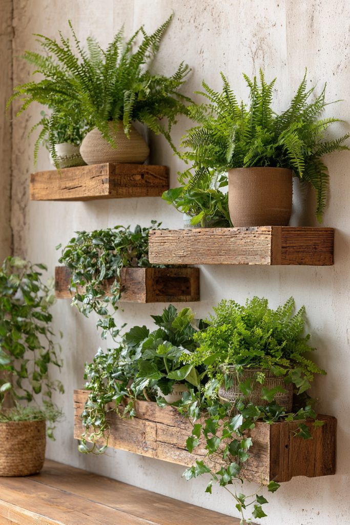 7. Rustic reclaimed wood shelves with ferns and ivy
