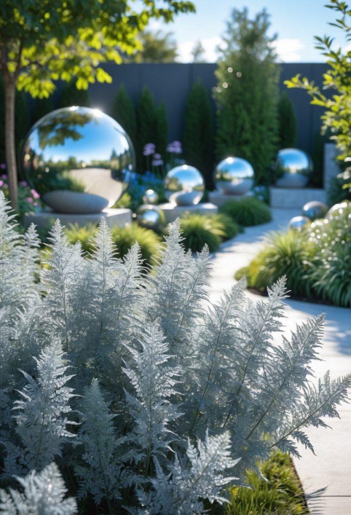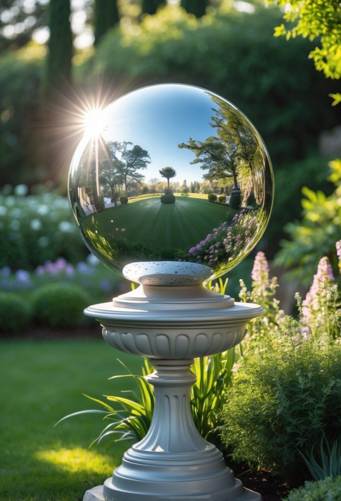 You can add a silver gazing ball on a pedestal to catch and reflect sunlight. This simple touch brightens up your garden and creates a cool, shiny spot.