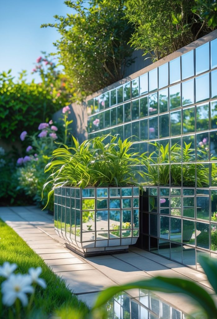 You can brighten your garden by placing mirrored tiles around planters or walls. These tiles reflect light, making your space feel cooler and more open. It also gives a stylish touch without needing much effort or space. Try it with small tiles for a mosaic look or larger ones for a bold effect.