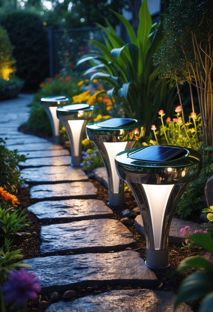 13. Install solar garden lights with reflective surfaces to brighten space