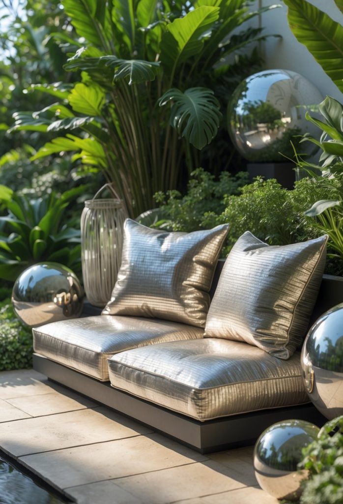 You can add outdoor cushions with metallic threads to bring a soft shine to your garden. These threads reflect light and can help keep the area feeling cooler.