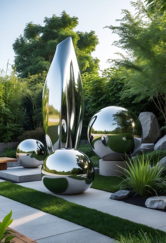2. Use polished stainless steel garden sculptures for a modern reflective touch