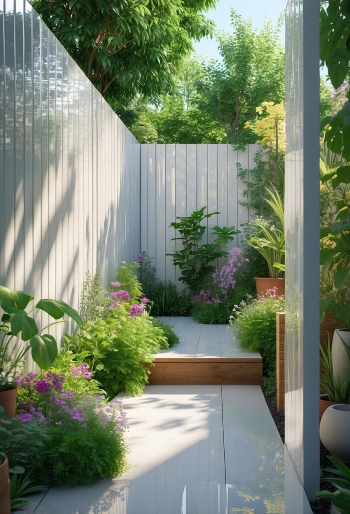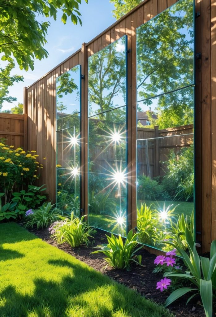 You can add glass or mirrored panels to your fence to brighten up your garden. These panels reflect sunlight, making your yard feel lighter and more open. This simple touch can also highlight your plants and flowers by reflecting their colors.