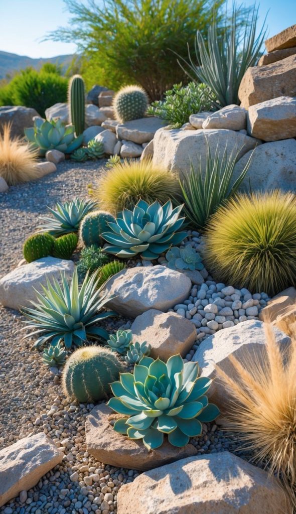 You can create a low-maintenance rock garden using succulents and cacti. Plant them in the holes of weathered rocks or in pots placed among stones. These plants need little water and add interesting shapes and textures to your garden.