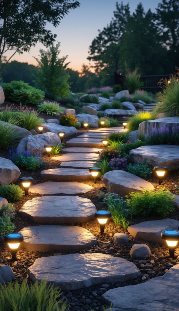 You can brighten your rockery garden by placing solar-powered lights along the paths. These lights charge during the day and turn on at night without needing wires. They help guide your steps and add a nice, soft glow to your garden space.