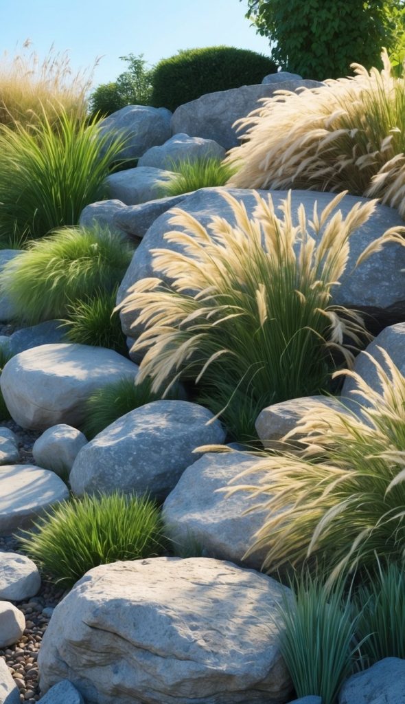 You can add soft movement and color to your rockery garden with ornamental grasses. They work well with stones and bring different heights to your space. Grasses like blue fescue are low-maintenance and add nice texture all year long.