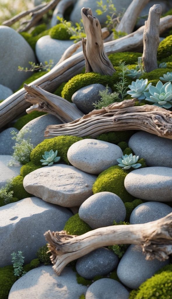 Place driftwood among the rocks to build contrast. This mix makes your garden feel calm and unique without a lot of work.