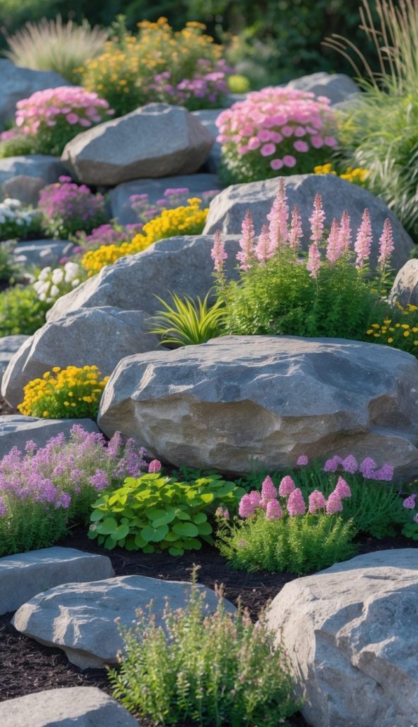 You can place large boulders near your flowering perennials to add texture and contrast. The rocks make the colors of the flowers stand out more. This mix also helps create natural borders and keeps your garden looking neat.