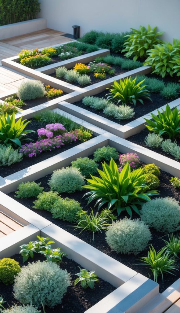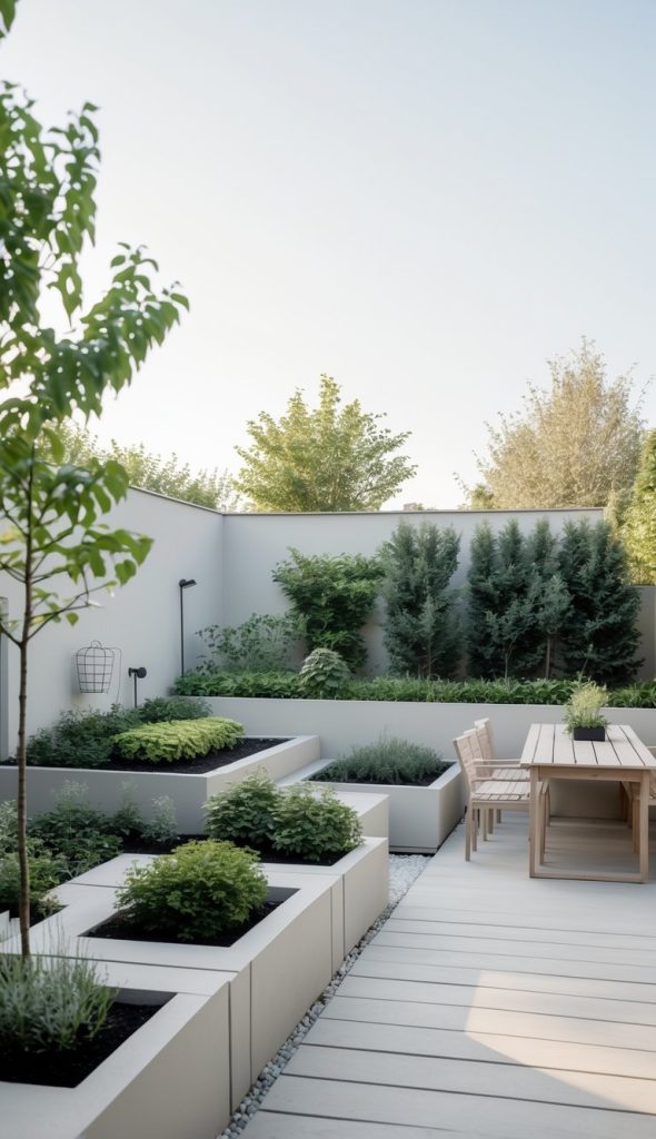 You can create clean lines and neat patterns by using geometric shapes in your garden beds. Squares, rectangles, and circles add a modern feel that fits well with Scandinavian style.