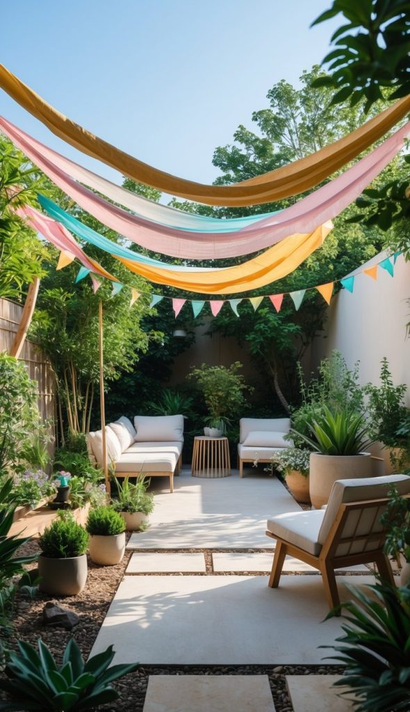 You can add soft touches like bunting or fabric canopies to make your garden feel cozy. These elements create gentle shade and add a splash of color without crowding the space. They also help soften the clean lines typical of Scandinavian design.