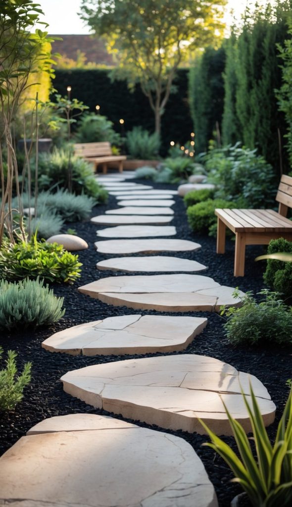 You can use natural stone to create simple, sturdy pathways in your garden. Stones like slate or sandstone add a nice texture and look natural. These paths help guide visitors and connect different parts of your yard while keeping a clean and calm feel.