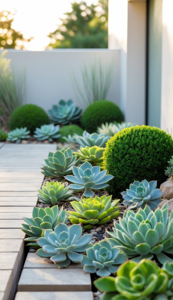 You can add simple beauty to your garden with succulents and small bushes. These plants need little water and care, making them great if you want a garden that’s easy to manage.