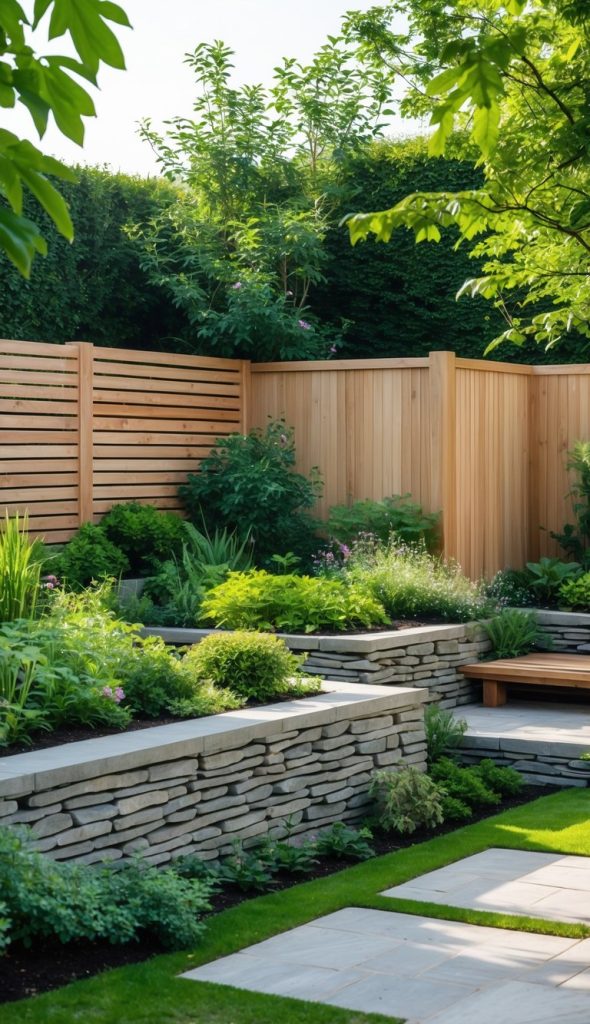 You can use natural materials like weathered wood and stone in your garden. These last longer and look good with plants.