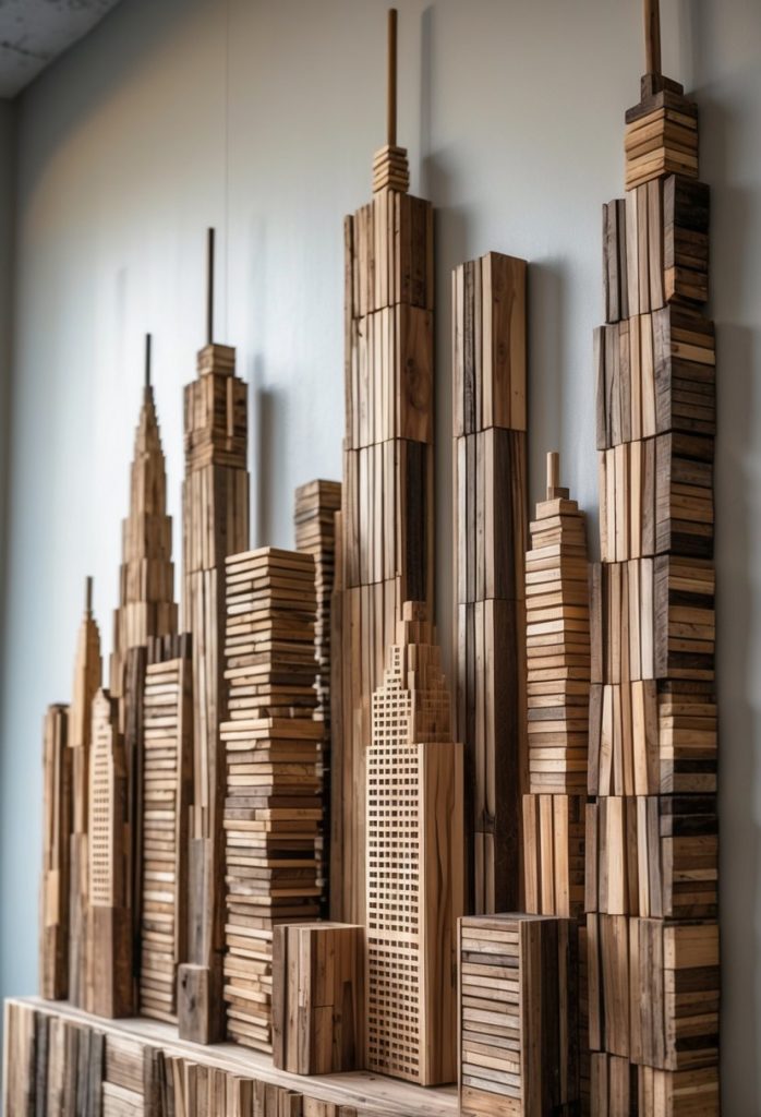 You can add a cool touch to any room with recycled wood city skyline art. These pieces use scrap wood to create shapes of buildings and city scenes.