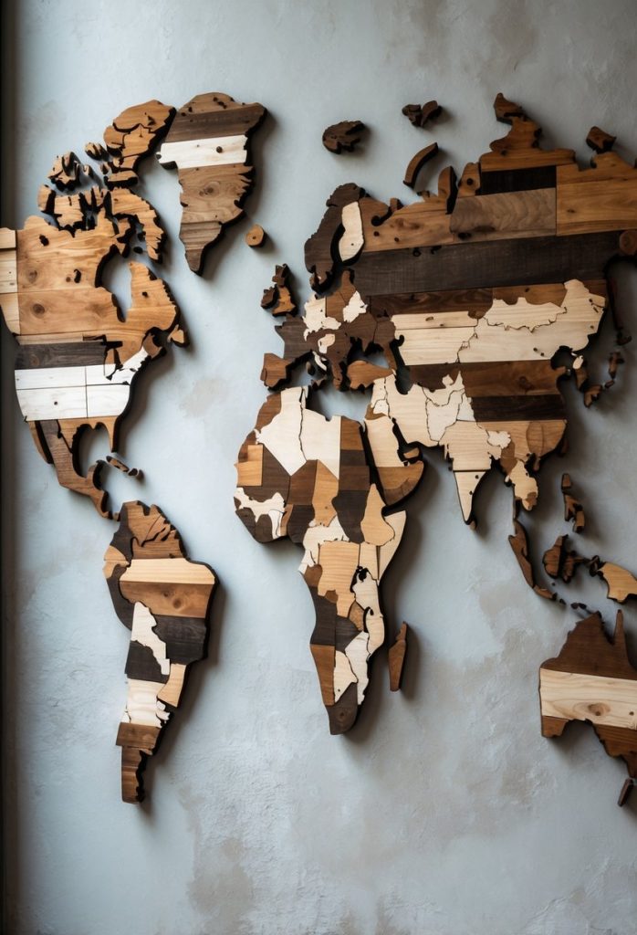 You can add a unique touch to your space with a reclaimed wood world map. These pieces are handcrafted from old wood, giving each map its own character and charm.
