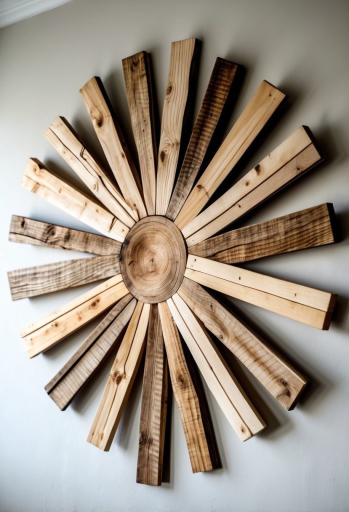 You can create a cool sunburst design using wood shims. These thin pieces of wood are easy to arrange into rays that spread out like the sun.