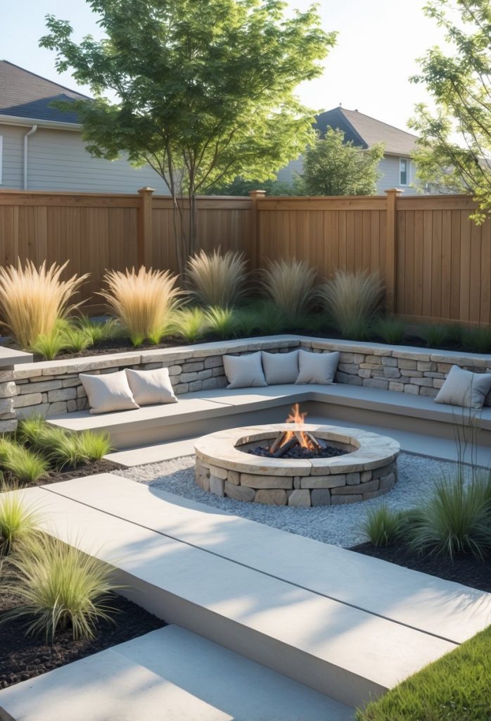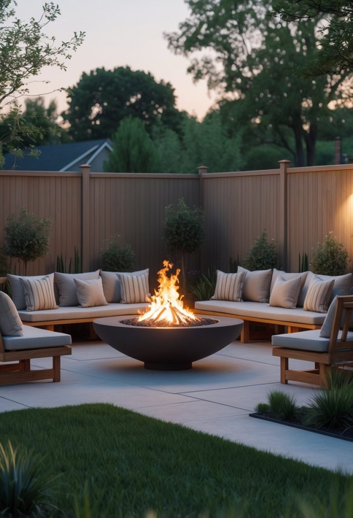 You can make your flat backyard warm and inviting by adding a fire pit. Place seats like Adirondack chairs or cushioned benches around it. This setup is perfect for relaxing or chatting on cool evenings. Adding soft lights nearby can make the space even more comfortable.