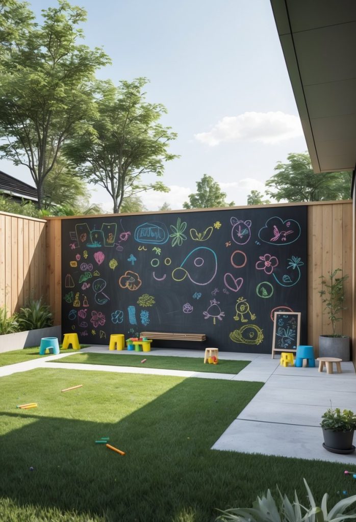 You can create a fun, writable space by adding a chalkboard wall in your backyard. Kids can draw, write, or play games anytime they want. This simple idea helps keep your kids busy and encourages their creativity in a mess-free way.