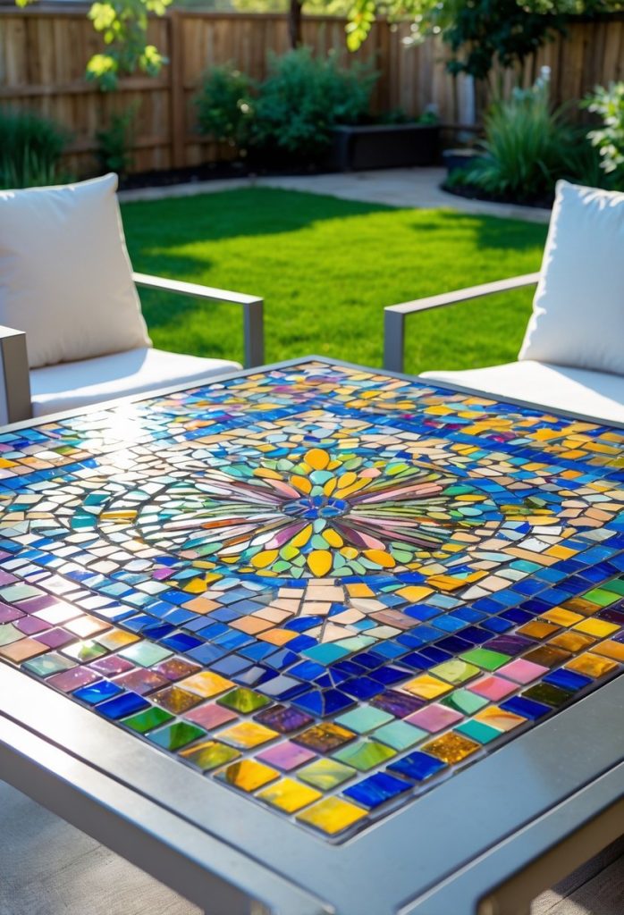 You can add charm to your backyard by placing a mosaic tile tabletop as a centerpiece. It creates a colorful and artistic focal point that fits many styles.