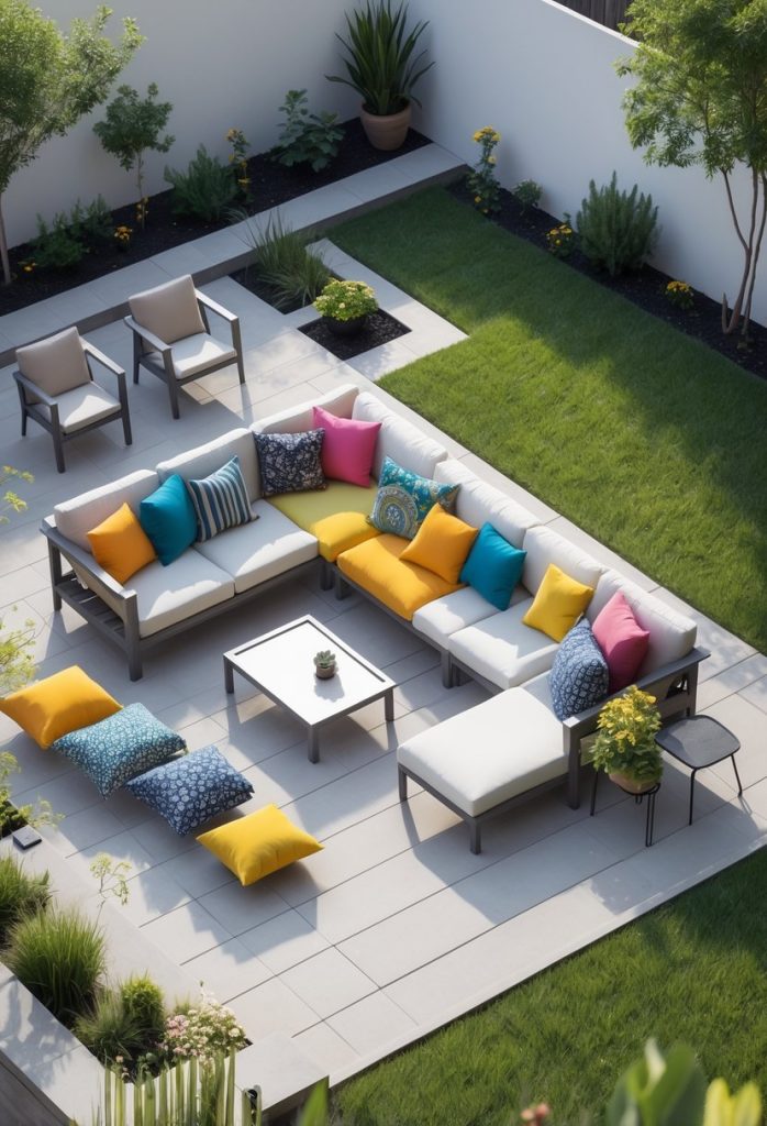 You can brighten your backyard by mixing different cushion colors and patterns. This adds style without much effort.