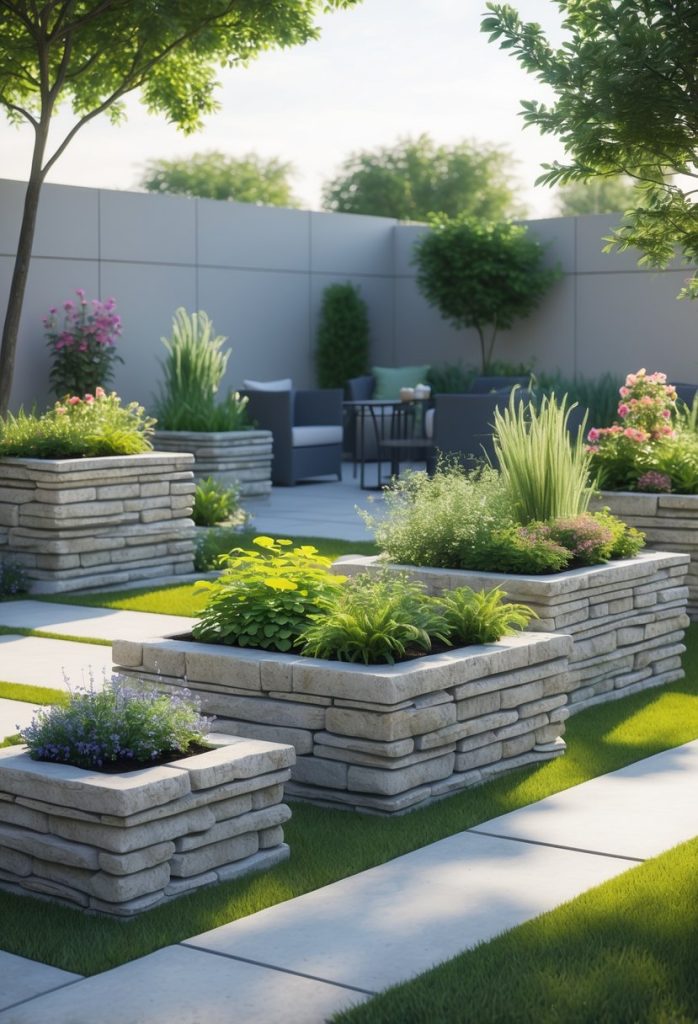 You can add charm to your backyard by using stacked stone planters. They bring texture and shape, making your garden look inviting.