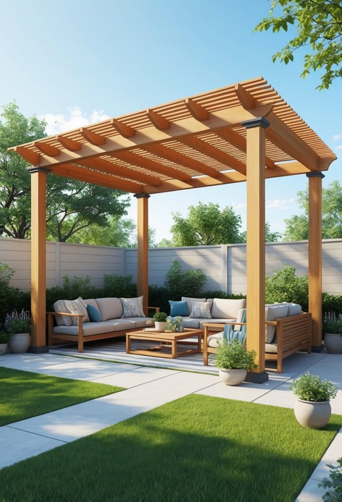 You can add a wooden pergola to give your backyard a cozy feel. It offers shade without blocking sunlight or airflow.