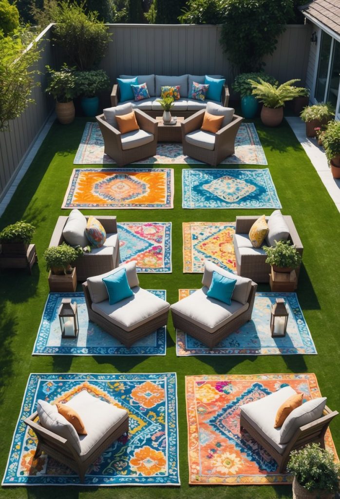 You can brighten your backyard by placing colorful rugs under your seating areas. They add comfort and make the space feel cozier.